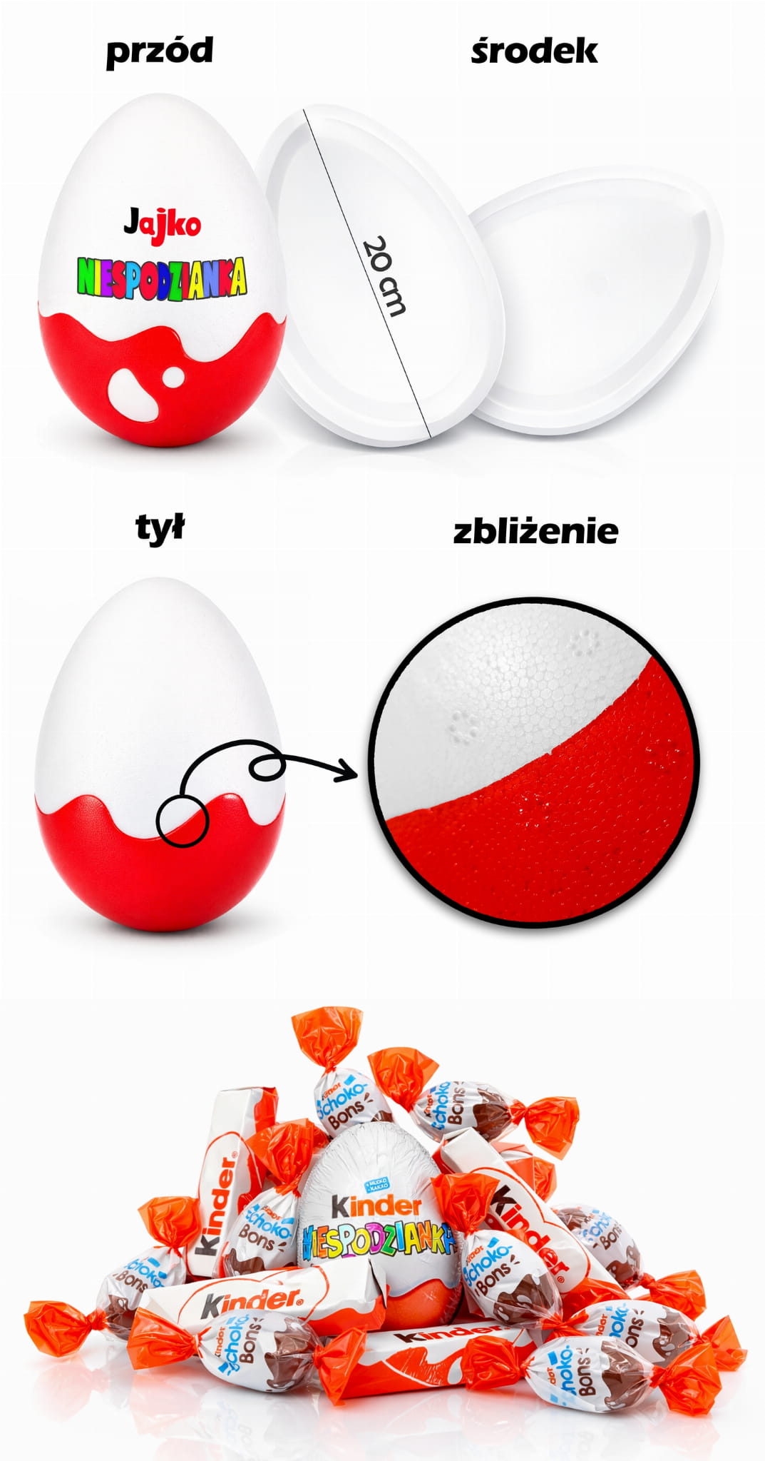 Jajko wypełniane jest słodyczami tuż przed wysyłką. W przypadku gdy z powodu czynników niezależnych nie uda nam się zdobyć któregoś z powyższych słodyczy, zamienimy go innym, bardziej atrakcyjnym – rzecz jasna, również Kinder.