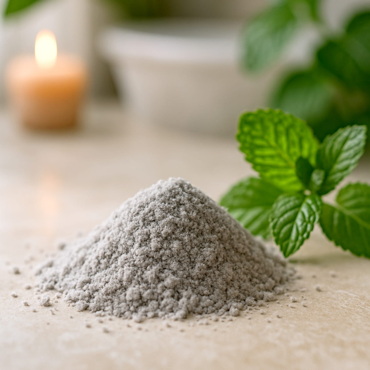 Musujący, zapachowy Puder do kąpieli MIĘTA Mint 200g. Szary, barwiący wodę, miętowy. Sól kąpielowa SPA z masłem SHEA dla dzieci i dorosłych.