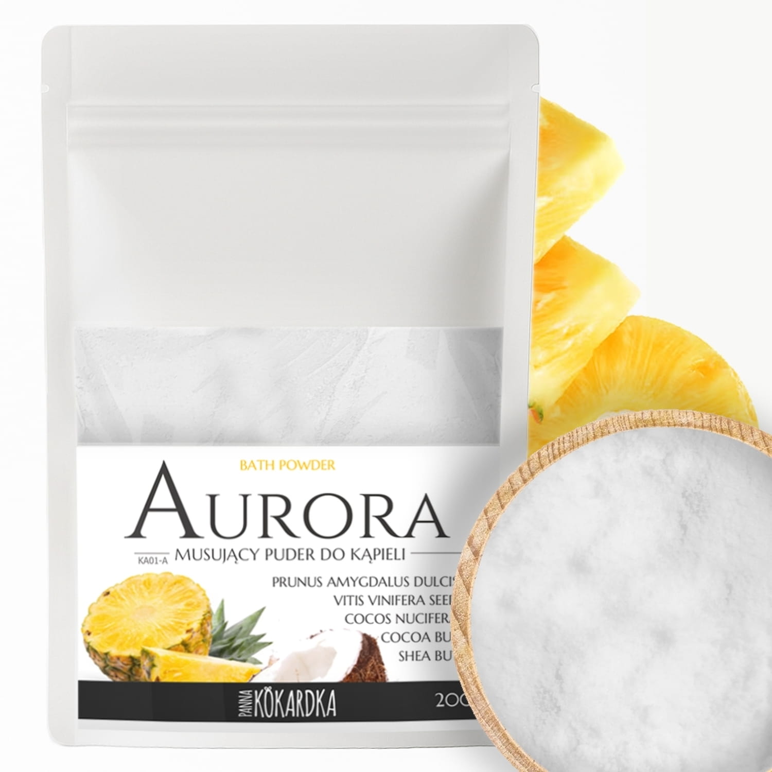 Musujący, zapachowy Puder do kąpieli PINACOLADA 200g Biały, barwiący wodę, kokosowy ananasowy. Sól kąpielowa SPA z masłem SHEA dla dzieci i dorosłych.