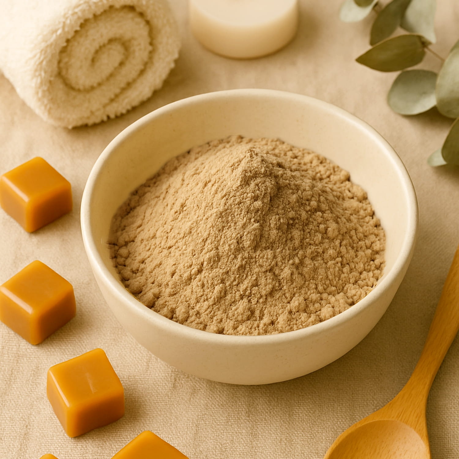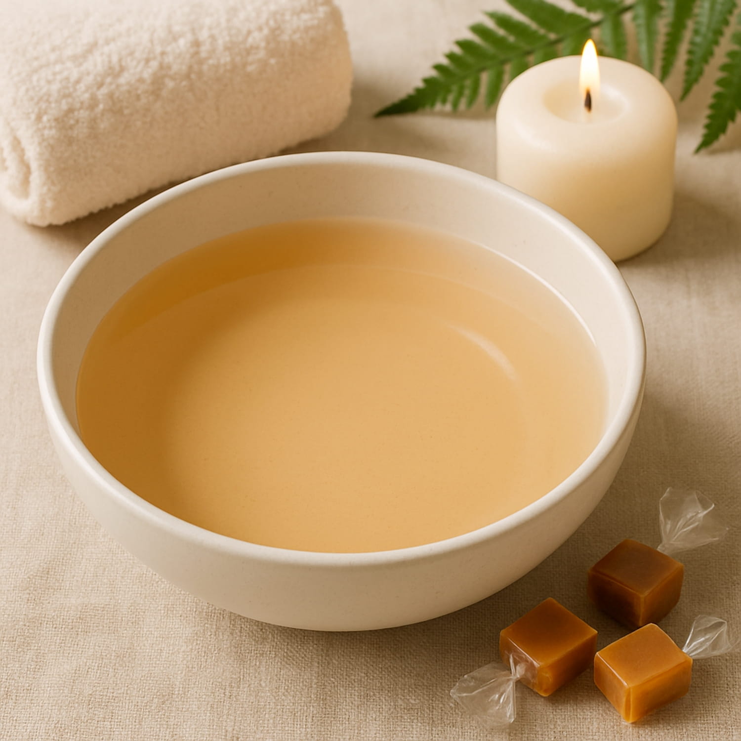 Musujący, zapachowy Puder do kąpieli KARMEL Caramel 200g. Beżowy, barwiący wodę, karmelowy. Sól kąpielowa SPA z masłem SHEA dla dzieci i dorosłych.