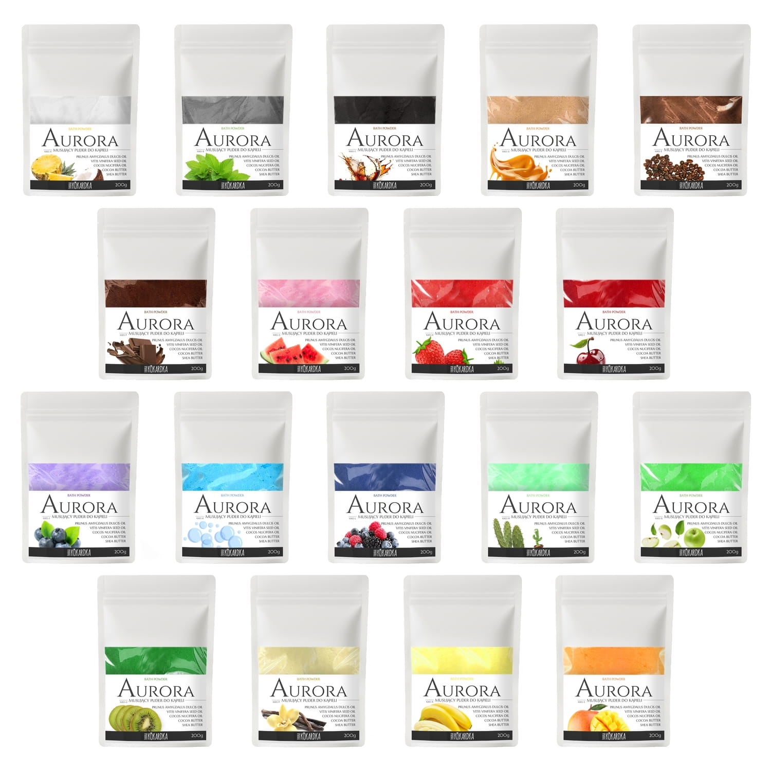 Przedstawiamy puder do kąpieli Aurora w 18 zapachach. Podobnie jak pozostałe nasze wyroby, nie jest on produktem wytwarzanym w wielkiej fabryce – tworzymy go od A do Z w naszej kokardkowej manufakturze, dbając o to by zawsze zawierał to co najlepsze i dostarczał wspaniałych doznań w trakcie kąpieli.