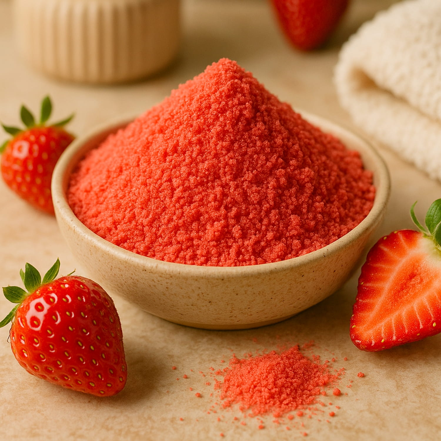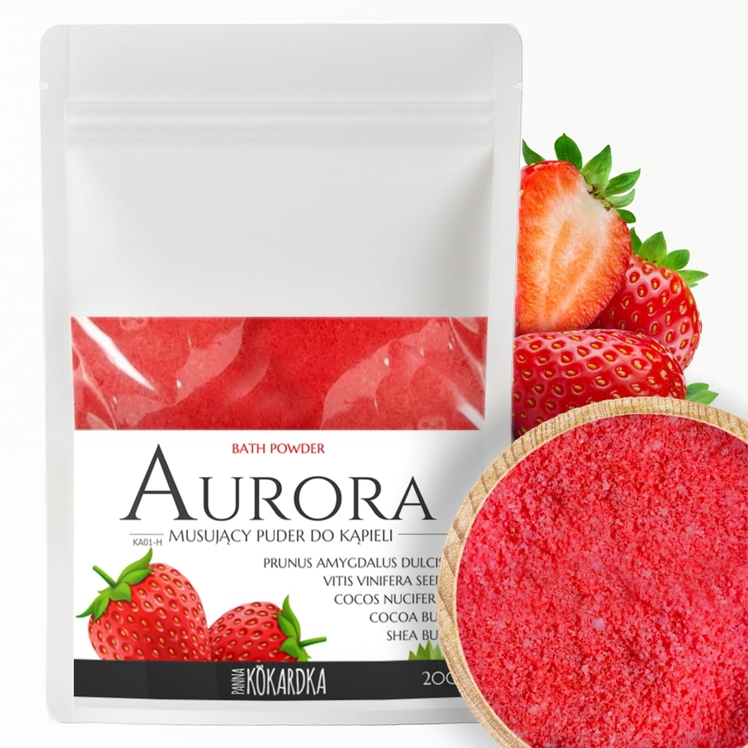 Musujący, zapachowy Puder do kąpieli TRUSKAWKA Strawberry 200g. Czerwony barwiący wodę, truskawkowy. Sól kąpielowa z SHEA dla dzieci i dorosłych.